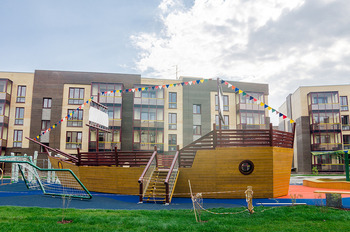 Планировка самого комплекса выполнена в виде лепестков дерева. Второй «лепесток» выполнен в морской тематике: на территории детской площадки детишек порадует 18-метровый корабль, гигантский осьминог, фонтан, скамейки в виде морских ракушек, а ребят постарше: скейт -площадка с волнами.